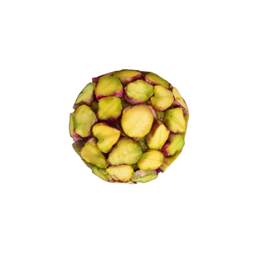 Fein gearbeitete, roh geformte Kugel mit zartem Mosaik-Muster. Eine elegante Spezialität, die Pistazien und Mandeln in einer harmonischen Süße vereint.