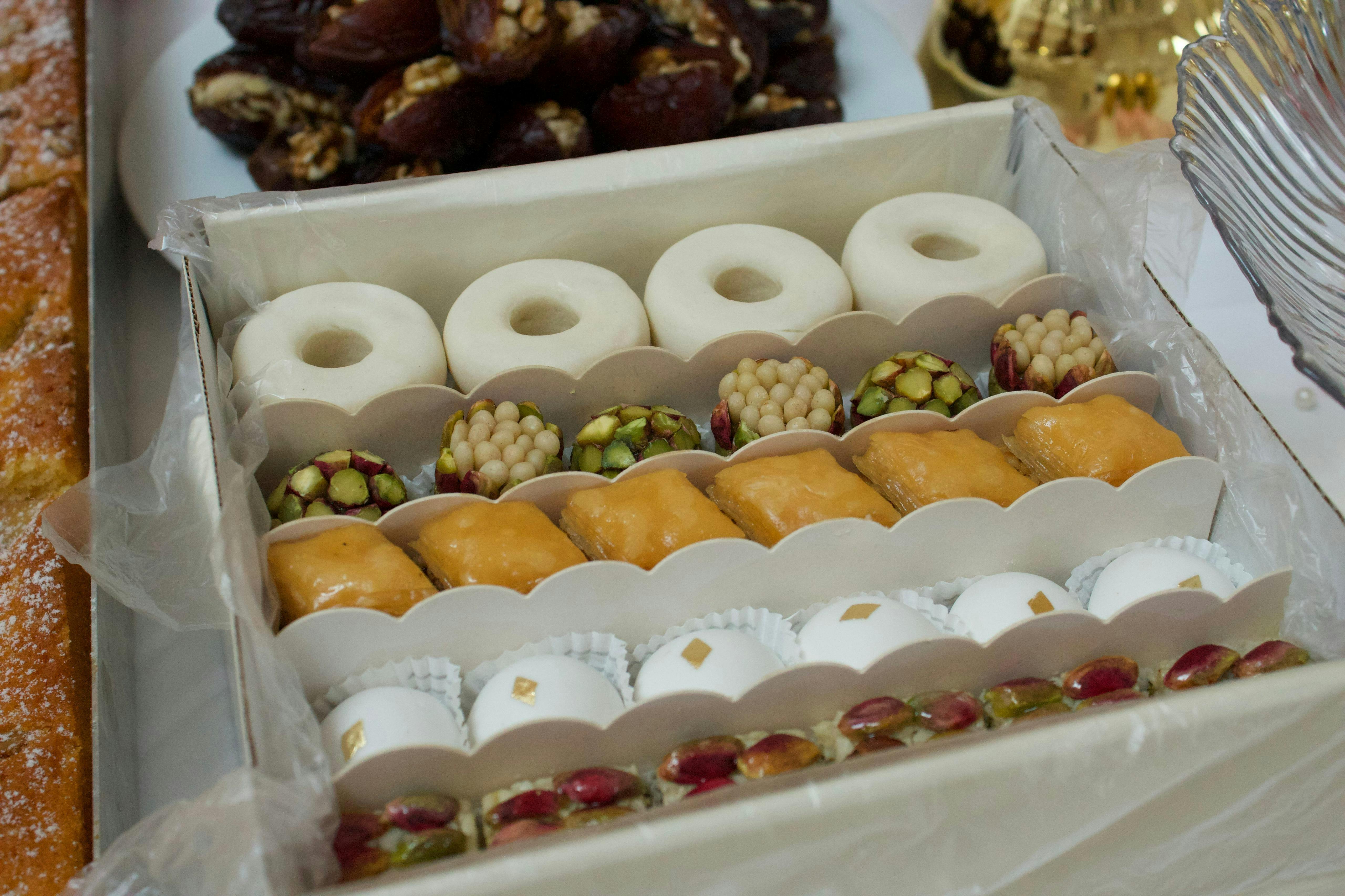 | Enthaltene Allergene | Schalenfrüchte: Mandeln, Haselnüsse, Pistazien, Pinienkerne,Gluten: Weizenmehl (Kaak Warka, Baklawa),Milch: Butter,Ei: Eier, Eiweiß. |